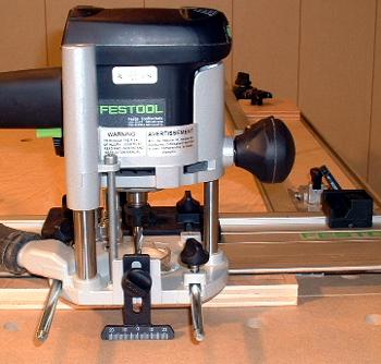 Using the guide rail stop that comes with the OF 1000 router, I attached the router to the guide rail. The sliding black plastic foot supports the side of the router not supported by the guide rail--simple and effective. I adjusted the router's depth of cut to match the tenon of the stretcher workpiece. There are several ways to do this. In this case I plunged the cutter to rest on top of the workpiece and set the stop rod by inserting reference bar of the desired depth of cut between the stop bar and one of the turret stops.